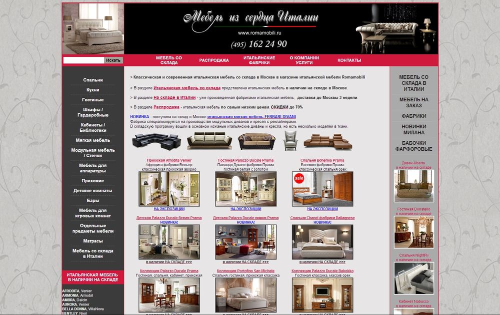 На сайте компании "Romamobili" представлена итальянская мебель более чем 650 фабрик Италии. Вся мебель: гостиные, спальни, кухни, кабинеты, корпусная мебель, мягкая мебель со склада или на заказ.
